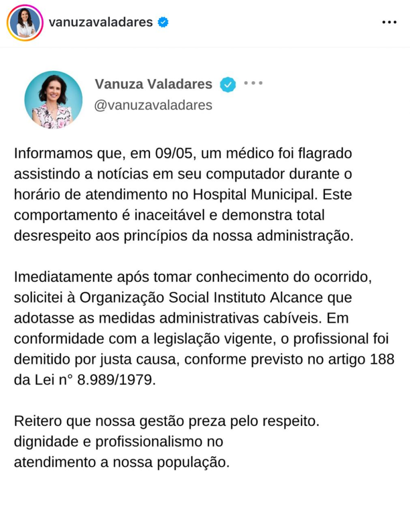 A conduta do profissional foi denunciada por meio de um vídeo nas redes sociais, e a reação da gestora foi rápida e contundente. “Infelizmente alguns profissionais não têm empatia com a dor do outro. Já comunicamos o Instituto para fazer o desligamento desse profissional”, afirmou Vanuza em resposta pública.